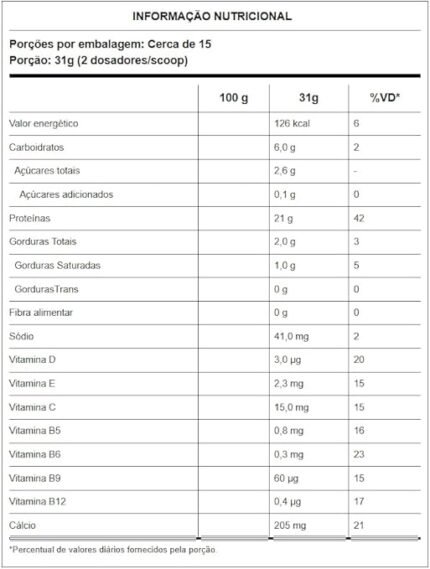 Ingredientes   Concentrado proteico de soro de leite (concentrado proteico de soro de leite e emulsificante lecitina), maltodextrina, mix de