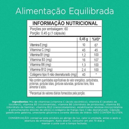 Ingredientes   Colágeno de frango tipo II, mix de vitaminas: [ácido ascórbico revestido (vitamina C), nicotinamida (vitamina B3), acetato de