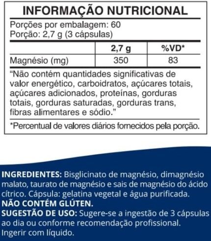 Ingredientes Bisglicinato de magnésio (magnésio), L-treonina, carbonato de cálcio, celulose microcristalina, estearato de magnésio e dióxido de silício. Cápsula: