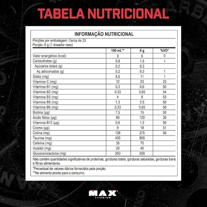 Ingredientes: Isomaltulose (Palatinose?), Alanina (3000mg/150ml), Arginina (1000mg/150ml), Taurina (800mg/150ml), Glucoronolactona (860mg/150ml), Colina (500mg/150ml), Melancia em pó (500mg/150ml), Tirosina (400mg/150ml) , Inositol (70mg/150 ml), Matchá (200mg/150ml – chá verde integral – Camelia Sinensis), aromatizante idêntico ao natural, acidulante ácido cítrico, Coenzima Q10 (75mg/150ml), isomalte, corantes naturais (INS 162) e (INS 160b), edulcorantes sucralose a acessulfame de potássio, ácido ascórbico (Vitamina C), Nicotinamida (Vitamina B3), Pantotenato de cálcio (Vitamina B5), Piridoxina (Vitamina B6) e Cianocobalamina (Vitamina B12). NÃO CONTÉM GLÚTEN. NÃO CONTÉM LACTOSE.Sugestão de uso: Adicione uma dose de 15 g (2 scoops) em 150-180 ml de água ou bebida de sua preferência e misture bem. Consumir 20 minutos antes do exercício ou conforme orientação de um profissional de saúde. Recomenda-se o consumo de 1 dose ao dia e para indivíduos maiores de 19 anos.