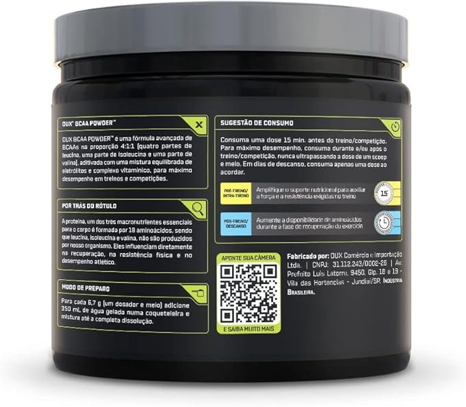 O BCAA Powder da Dux Nutrition possui uma fórmula avançada à base de BCAAs na proporção 4:1:1 (quatro partes de Leucina, uma parte de Isoleucina e uma parte de Valina), aditivada com uma mistura excepcional de eletrólitos e complexo vitamínico, para entregar desempenho máximo em treinos e competições. A proteína, um dos três macronutrientes essenciais para o corpo, é formada por 20 aminoácidos, sendo que os 3 mais importantes (Leucina, Isoleucina e Valina) não são produzidos por nosso organismo. Eles auxiliam o atleta em treinos e competições, melhorando o desempenho, prevenindo o catabolismo muscular e estimulando a síntese proteica. BENEFÍCIOS: > Matéria-prima importada, vegetal, de grau farmacêutico (a maioria dos BCAAs de mercado é feita com penas de pato e pele de porco); > Aditivado com micronutrientes especificamente formulados para atuar no desempenho atlético, construção e proteção muscular; > Combinação perfeita de eletrólitos, que garante hidratação adequada; > Composição funcional, sem ingredientes inofensivos e vegana; > Não contém substâncias ilícitas, goma xantana, espessantes, estabilizantes, conservantes ou qualquer outro ingrediente inferior; > Contém corantes 100% naturais, sem ingredientes artificiais; > Ideal para treinos de força ou com cargas (bodybuilding, crossfit, powerlifting e artes marciais), esportes de alto rendimento (triathlon, ciclismo, corrida e natação) e esportes de explosão e parada (artes marciais, basquete, tênis e futebol).