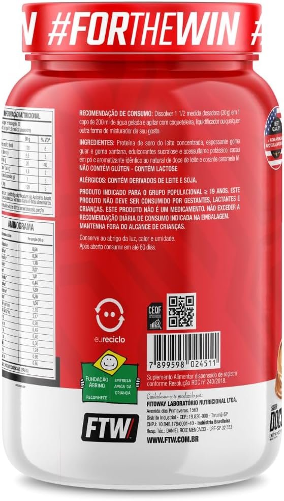 FTW 100% Whey Protein com Proteína Concentrada WPC, Suplemento Alimentar Pós-Treino em Pó com Fonte de Proteína do Soro do Leite, Alto Valor Biológico, Sem Glúten – Pote 900g (Sabor Doce de Leite)