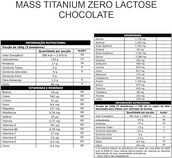 Mass Titanium 17500 Zero Lactose (2,4kg) Hipercalórico completo e sem lactose! MASS TITANIUM 17500 ZERO LACTOSE combina três fontes proteicas de alta biodisponibilidade e digestibilidade e duas fontes de carboidratos. Sua fórmula conta ainda com vitaminas e minerais que contribuem para a metabolização dos macronutrientes. BENEFÍCIOS: > Zero Lactose;> 17g de proteína por porção;> 1.849 mg de BCAA por porção;> Com WPI;> Auxilia na formação dos músculos;> Fonte de vitaminas e minerai.