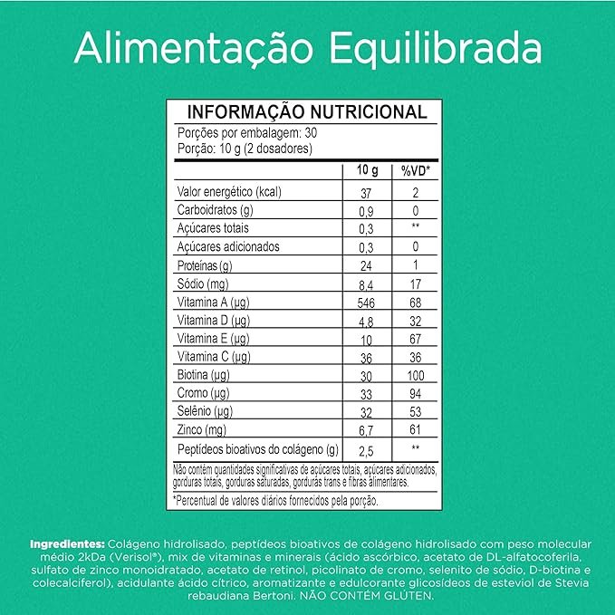 Colágeno hidrolisado, peptídeos bioativos de colágeno hidrolisado com peso molecular médio 2kDa (Verisol®), mix de vitaminas e minerais (ácido ascórbico, acetato de DL-alfatocoferila, sulfato de zinco monoidratado, acetato de retinol, picolinato de cromo, selenito de sódio, D-biotina e colecalciferol), acidulante ácido cítrico, aromatizante e edulcorante glicosídeos de esteviol de Stevia rebaudiana Bertoni. NÃO CONTÉM GLÚTEN.