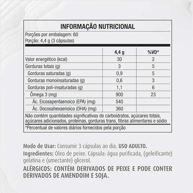 Óleo de peixe, água purificada, (geleificante) gelatina e (umectante) glicerol. “NÃO CONTÉM GLÚTEN.”