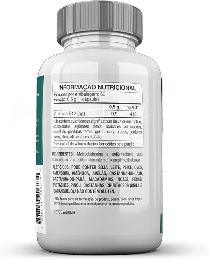 Metilcobalamina e antiumectante talco. Composição da cápsula: glaceante hidroxipropilmetilcelulose. ALÉRGICOS: PODE CONTER SOJA, LEITE, PEIXE, OVOS, CRUSTÁCEOS (KRILL E CARANGUEJO) E SEUS DERIVADOS.¹ NÃO CONTÉM GLÚTEN. ¹ Não fazem parte da formulação do produto, porém, pode haver traços devido ao compartilhamento de equipamento no processo produtivo.