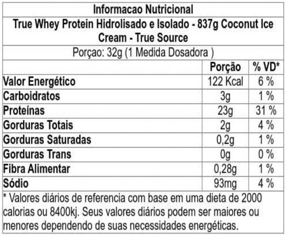 | Nome do produto | True Whey (837g) – Hidrolisado e Isolado – Sabor Coconut Icecream |