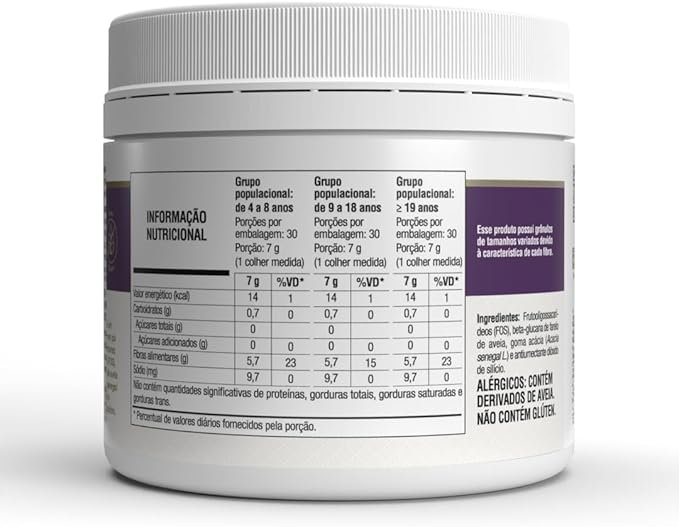 Amido resistente de milho com alto teor de amilose, frutooligosacarídeos (FOS), inulina e antiumectante dióxido de silício. ALÉRGICOS: CONTÉM DERIVADOS DE AVEIA. NÃO CONTÉM GLÚTEN.