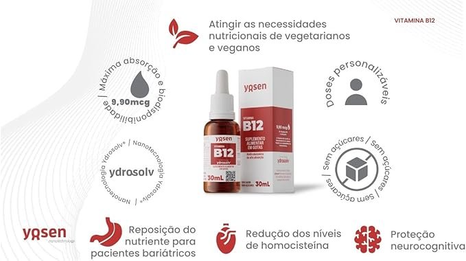Vitamina B12 de Alta Absorção Ydrosolv Yosen é um suplemento alimentar em gotas na forma de Metilcobalamina, ou seja, a vitamina B12 na sua melhor forma de altíssima absorção atualmente conhecida.