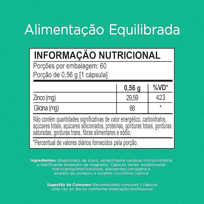 Sugestão de consumo:Consumir 1 cápsulas uma vez ao dia ou conforme orientação profissional. Ingredientes:Bisglicinato de zinco, estabilizante celulose microcristalina e lubrificante estearato de magnésio. Cápsula verde: estabilizante hidroxipropilmetilcelulose, glaceantes carragena e acetato de potássio e corante clorofilina cúprica”. NÃO CONTÉM GLÚTEN. NÃO CONTÉM LACTOSE. NÃO CONTÉM AÇÚCAR.